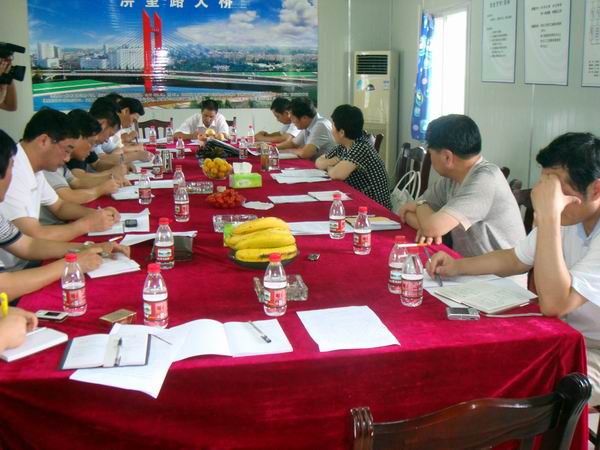 李書記一行首先深入施工現(xiàn)場,一邊詢問工程進(jìn)展情況,一邊查看和指導(dǎo)。隨后在淠望路項目部會議室聽取了六安市建委、項目監(jiān)理單位、施工單位對淠望路大橋項目管理、施工進(jìn)度等情況的匯報。李書記在肯定項目前期工作成績的同時,對淠望路大橋后期施工工作提出了具體要求和指導(dǎo)意見:一、工程項目重要性。淠望路大橋乃是六安市重點建設(shè)工程之一,地處城市核心地帶,是貫通新老城區(qū)的一條重要聯(lián)系紐帶,建成后將成為六安市標(biāo)志性的建筑;二、目標(biāo)要明確。淠望路大橋的建設(shè)是六安人民關(guān)注的焦點,政治和社會意義重大,市委市政府高度重視。要求施工單位要加強質(zhì)量控制,加快工程進(jìn)度,在施工各個環(huán)節(jié)力求做到科學(xué)化、規(guī)范化、程序化、標(biāo)準(zhǔn)化,要優(yōu)質(zhì)、高效、安全、按期完成淠望路大橋施工任務(wù),力爭奪取“黃山杯”;三、措施要有效。要求施工單位加大機(jī)械設(shè)備和人員的投入,并認(rèn)真落實各項措施,確保組織管理到位,現(xiàn)場技術(shù)力量到位,既定進(jìn)度到位,安全管理到位,質(zhì)量控制工作到位,爭取把淠望路大橋建成優(yōu)質(zhì)工程,早日向六安市人民交上一份滿意的答卷。最后,李書記對安徽路橋在淠望路大橋建設(shè)中做出的努力給予了高度的評價。