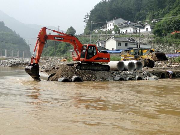 從27日開始,天氣放晴,水位下降,我部抓住機(jī)會進(jìn)行第三次搶修,一臺挖機(jī)、一臺裝載機(jī)和五臺運(yùn)輸車同時作業(yè),終于在28日上午打通便橋。項(xiàng)目部迅速組織人員把施工設(shè)備、施工材料調(diào)運(yùn)到對面,28日下午恢復(fù)小型結(jié)構(gòu)物施工。