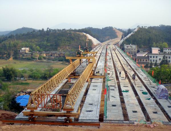 站塘大橋的中心樁號為K1497+532,全長306米,共12跨,是我標(biāo)段最長的一座大橋。上部構(gòu)造為25米預(yù)應(yīng)力箱梁,共96片,下部結(jié)構(gòu)共有樁基52根、蓋梁26片。站塘大橋的梁板是從2號梁場運過來的。在運梁過程中,由于遇到連陰雨天氣,導(dǎo)致道路潮濕,不能承受梁板的重量。針對這種情況,項目部積極開拓思路想辦法,不等不靠,通過用碎沙石鋪出一條道路來保證運梁不受影響。在春節(jié)復(fù)工后,項目部又加大人力物力投入。架梁過程中,橋梁技術(shù)人員始終堅守在施工一線,做好分部分項技術(shù)交底和安全防護(hù)工作,保證了架梁的進(jìn)度、質(zhì)量和安全。